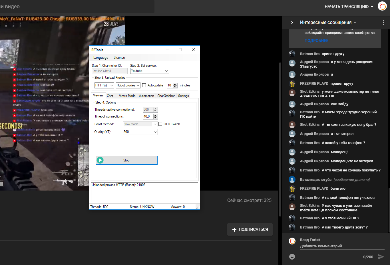 Admin Опубликовано 28 апреля, 2019 Автор Опубликовано 28 апреля, 2019 1 минуту назад, vergilia сказал: провел тест на рандомном канале где было 2-4 зрителя настоящих. 500 потоков делей 40 был скачет до 500 зрителей потом упало до 150 и так держало. После 3 окна по 90 потоков делей 40 100 200 так же было 150-160 зрителей выше показатель не рос, как понимаю с старой версией не чем не различается? Кто еще проводил тесты отпишите результаты. это с делеем в 40? Потому как на 300 стабильно держало у меня 147-150.