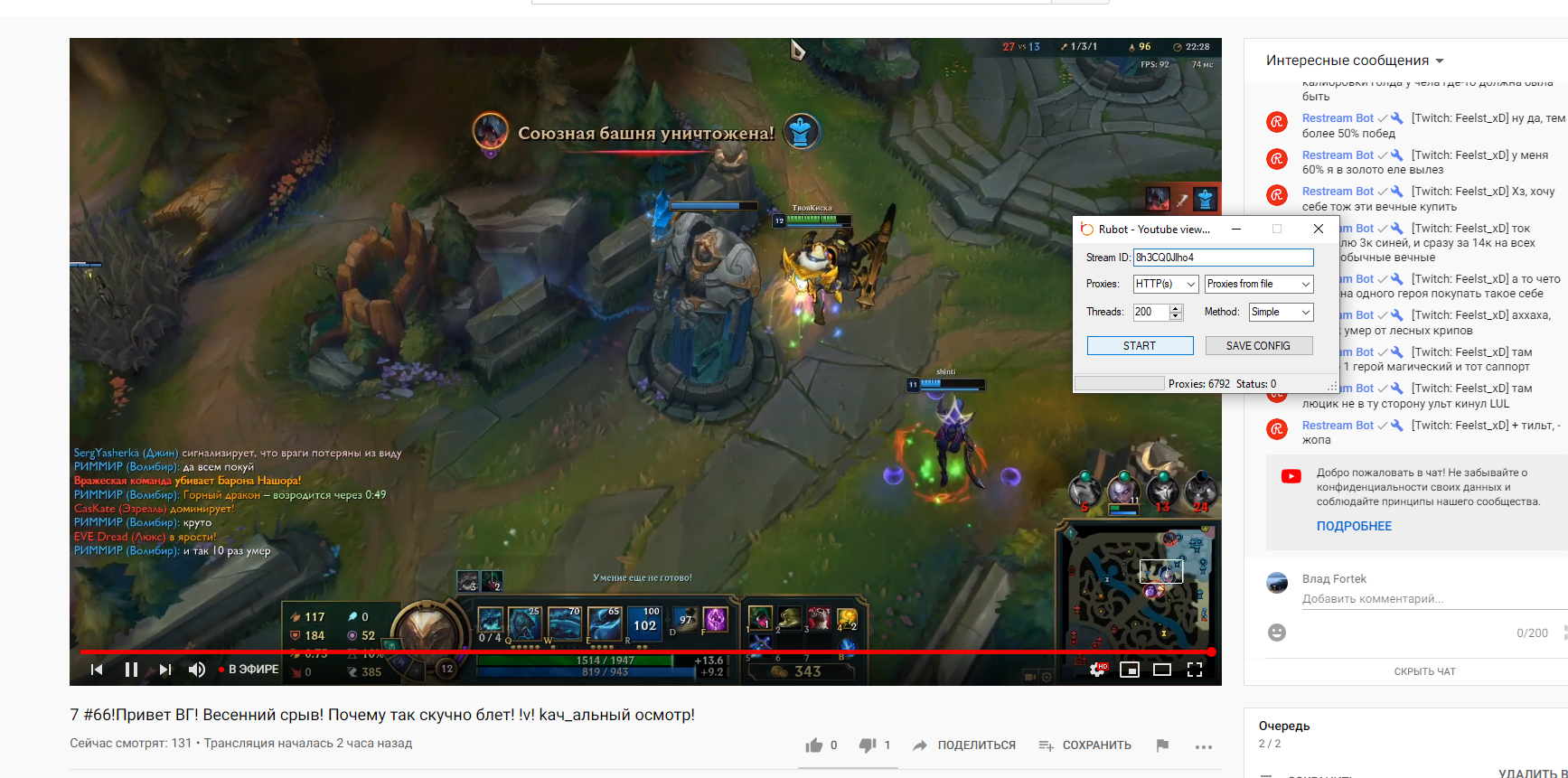 Admin Опубликовано 7 марта, 2020 Опубликовано 7 марта, 2020 1 минуту назад, onacobyn toy сказал: А как быть тогда с рубот проксями? Их же в лаунчере нет? Или вы по такому случаю заодно добавите их в лаунчер? рубот прокси будут добавлены. До модуля я пока что не доходил, т.к. был занят воркингом модуля чат-ботов Твич с чекингом. Сейчас конкретно ютубом занят, все добавлю.