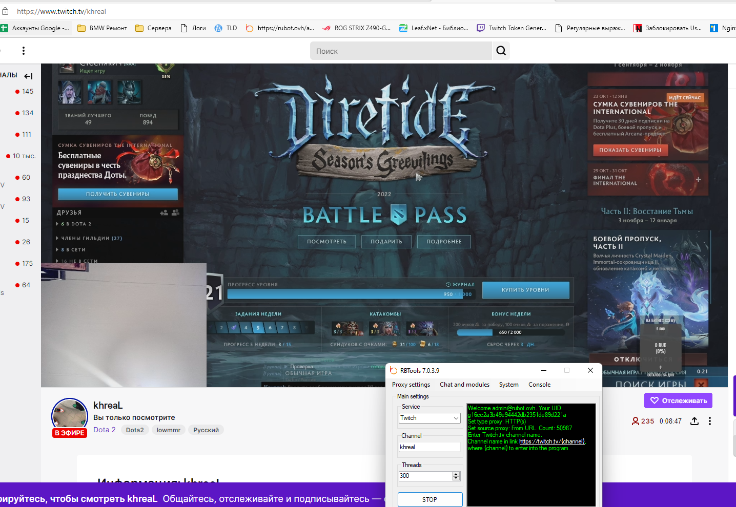 Admin Опубликовано 7 ноября, 2022 Опубликовано 7 ноября, 2022 17 hours ago, Piter said: сделал все правильно, название канала, порты 500, прокси из Asocks вставил (20к вышло список ip и порт), загрузил их, выбирал и http и socks5. нажимаю старт, ползунок двигается но ничего не накручивает, ждал 5 минут. менял гео прокси, вообщем все равно не работает почему то. 1. Пишем максимально развернуто, куда, т.е. на какой сервис используем накрутку, здесь не ограничивается только 1 сервисом. 2. Но залез в ваши логи и глянул что вы пытались крутить на Твич. Asocks проверил. Советую внимательно все читать, возможно вы не прописали свой IP в белый список, т.е. не сделали привязку. Да, не только программу надо привязывать к своему IP, но еще и прокси. И по проблемам писать строго в тему по которой у вас возникли трудности, т.е. сюда https://rubot.ovh/topic/639-private-conference-twitch/ это для Твича Spoiler Тему закрываю, т.к. максимально разжевал.