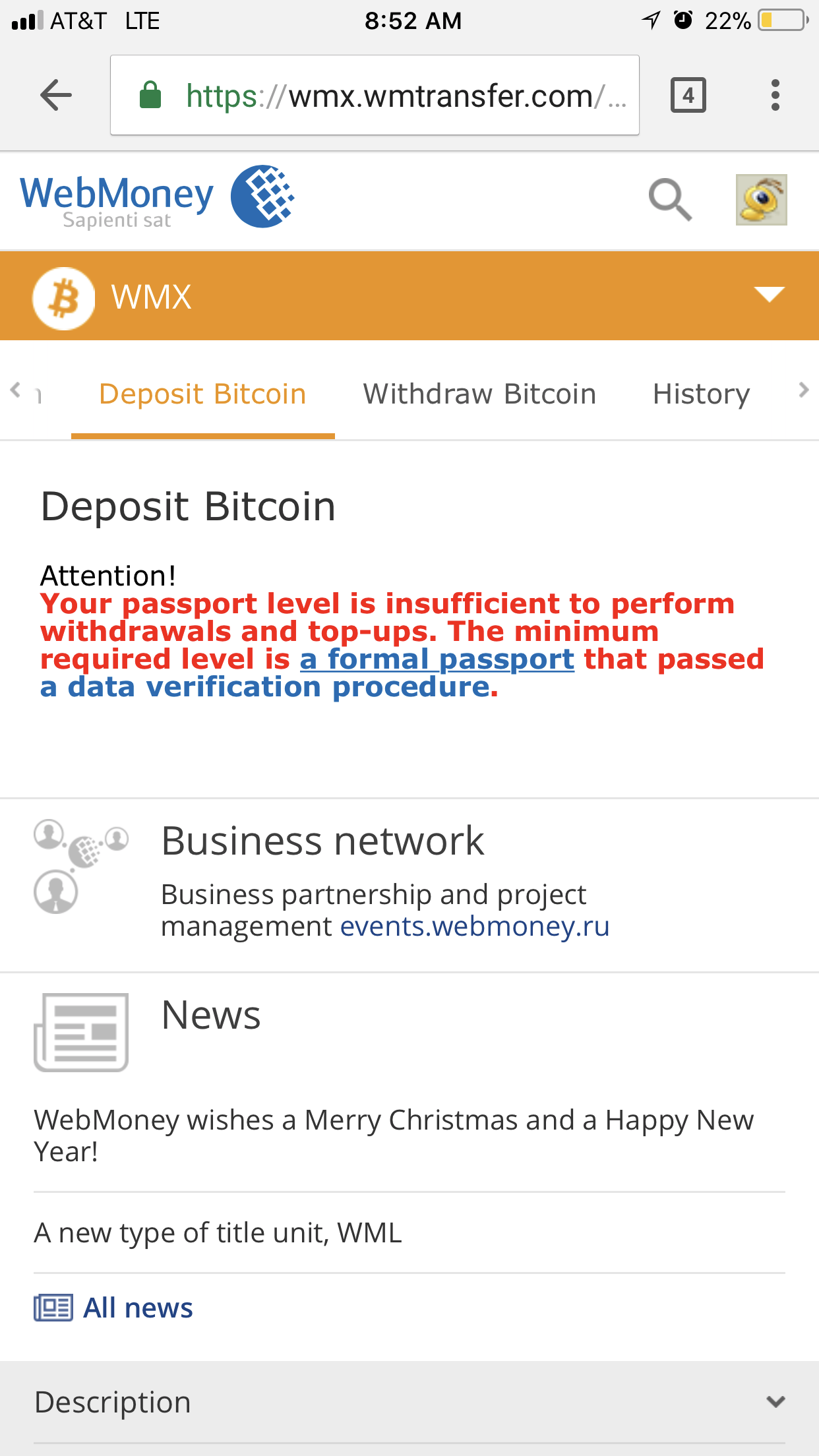 Гость alphacasters Опубликовано 24 января, 2018 Опубликовано 24 января, 2018 37 минут назад, SOA сказал: nope, just create an account and go to your wallets and create a BTC wallet then transfer btc to that webmoney wallet and you should be good on making payments through webmoney. I get this error when trying to top off or transfer funds. How old is your account? I made mine 2 days ago so it may be a new verification process. I guess I’ll photoshop a passport and hope they don’t do actual data record searching. If you’ve got any ideas let me know! Alpha Цитата