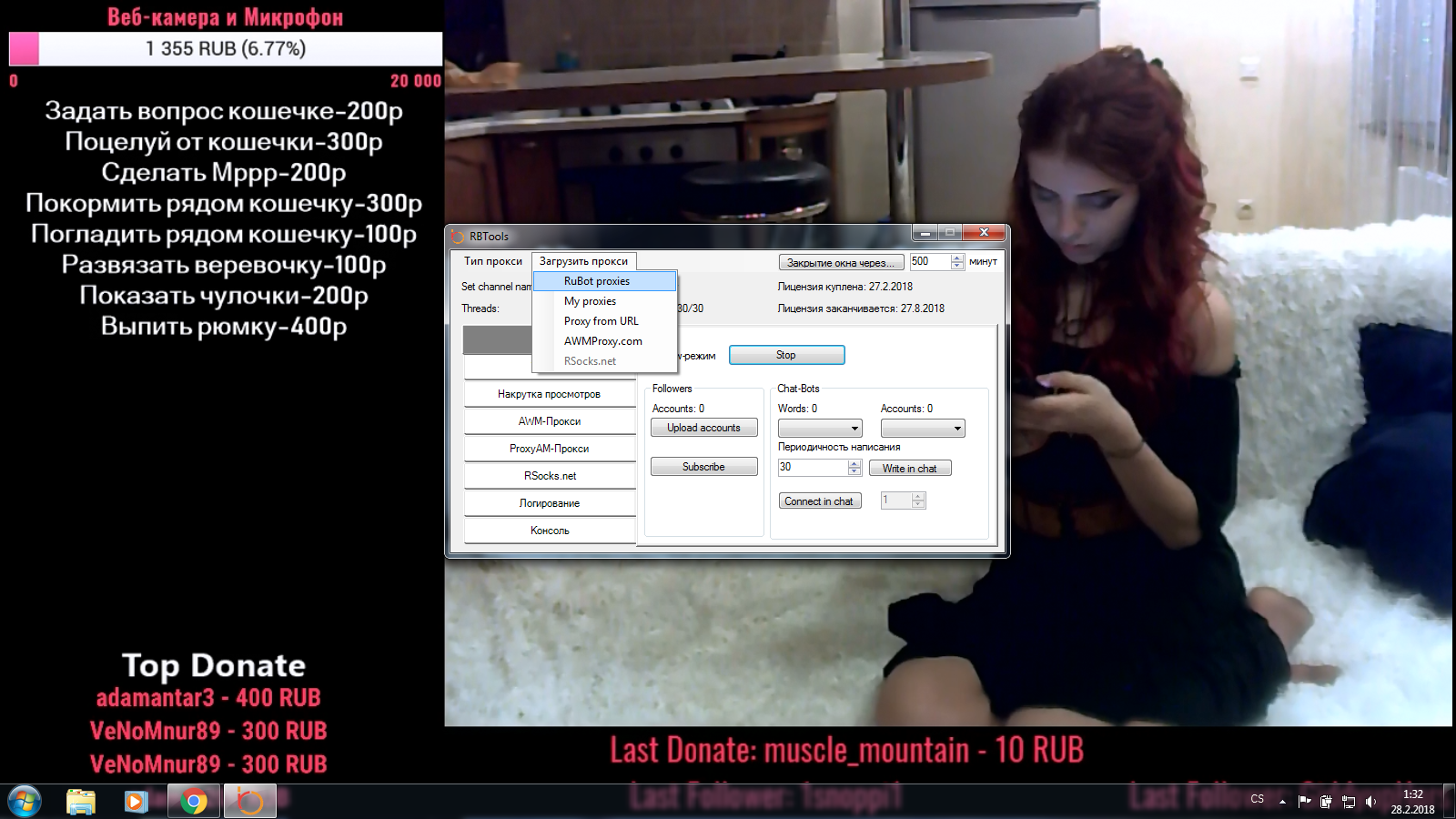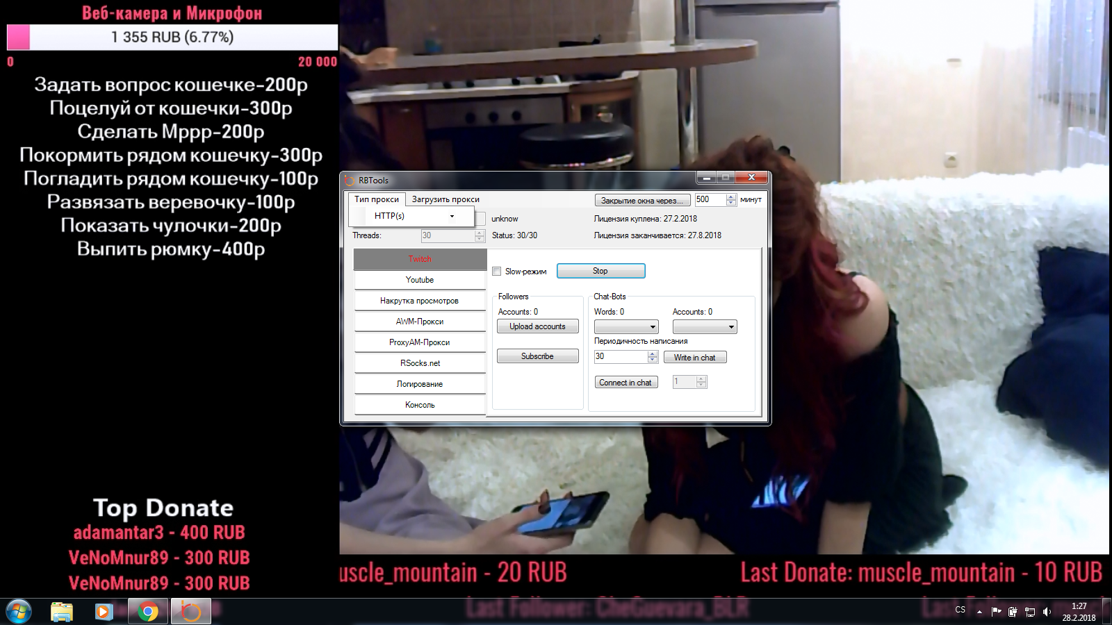 Гость mptrojky Опубликовано 28 февраля, 2018 Опубликовано 28 февраля, 2018 Я начал программу. Теперь я не знаю, что делать, чтобы он работал правильно. Может кто-нибудь, пожалуйста, посоветуйте мне? Есть ли видео-гид? Я хочу добавить аудиторию здесь: https://www.twitch.tv/aleksandrason. Я нажал RuBot proxies. И это не работает, не добавит зрителей. Цитата