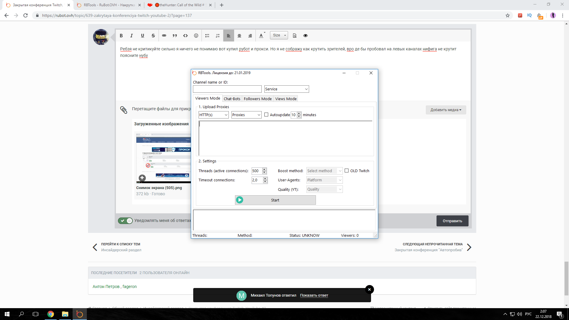 Гость Антон Петров Опубликовано 21 декабря, 2018 Опубликовано 21 декабря, 2018 4 минуты назад, Relic сказал: Если ютуб вводишь код видео после равно (=) сервис выбираешь ютуб , грузишь прокси если у тебя ссылка в больше окно , выбираешь последнюю строчку , потом буст метод , хард и старт , по твичу только логин канала после / Бро спасибо а прокси что я купил это прокси рубот получается выберать? и ещё вопрос лайки тоже тут можно крутить потому что вижу есть раздел, если у меня инет 200 мб стрим не будет проседать допустим если 5 окон врублю