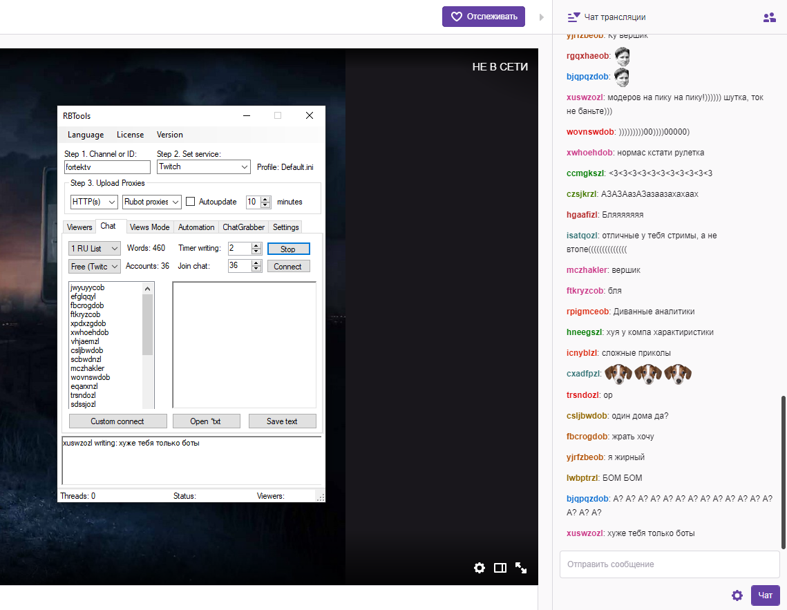Admin Опубликовано 21 сентября, 2019 Автор Опубликовано 21 сентября, 2019 5 минут назад, Алексей Петров сказал: Достоверно проверил на некольких аккаунтах. Т.е есть акки которым или кто-то скручивает( что мало реально, кому нужны нонеймы?) либо твич сделал черный список для накрутчиков. Т.е стартуешь прогу, берешь рандомный стрим с твича с 2 зрителями, ру бот полноценно крутит сколько нужно 300-500итд затем меняешь адресс канала на свой(которому твич не дает крутить) итого 0 т.е полный ноль ни 1 зритель не добавляется, не закрывая программу ставишь ник любого рандома с твича, спокойно крутить хоть сколько. Т.е программа работает, но походу твич сделал черный список, где программа не крутит( полный 0) выше это несколько человек подтвердили. Могу продемонстрировать если ты в дискорде есть скорее временная проблема. Сейчас наблюдаю аномальное количество зрителей, которое выкрутить раньше было нереально или с трудом и у некоторых с большим ожиданием.
