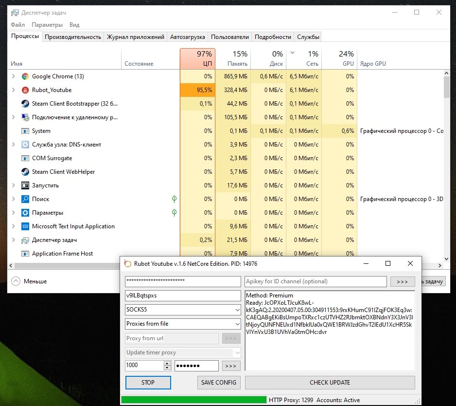 Admin Опубликовано 10 апреля, 2020 Автор Опубликовано 10 апреля, 2020 Выпущен апдейт. Скачивать из темы. В дальнейшем все апдейты напрямую из модуля. Все просто - жмете кнопку, выскакивает уведомление что апдейт скачался, открывается папка с указанием курсора на архив. Распаковываете и пользуетесь. Принцип следующий - крутить в 10 потоков уже не требуется, т.к. поменялся метод проксирования. Ищите хорошие пулы IPv6 прокси. Чем их больше тем лучше накрутка. Нагрузку на железо так же пофиксил, ввиду увеличения таймаута на прокси. Как определить качество накрутки? Открываете Диспетчер задач и смотрите на состояние сети, если программа активно нагружает сеть, значит прокси хорошие и данные проходят эффективно. Как использовать IPv6 прокси? Они идут в формате IPv4 с разными портами. Поэтому выставляйте режим SOCKS5