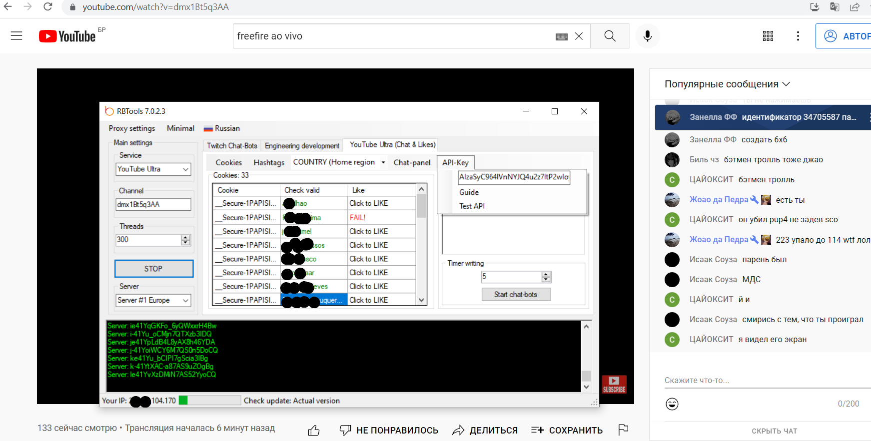 Гость kingsman85 Опубликовано 19 марта, 2022 Опубликовано 19 марта, 2022 (изменено) Друзья, у меня на стриме не более 400 зрителей и я купил у вас все пакеты: RBTools; Индивидуальный IP для вьюботов YouTube; Сервис-Прокси; модуль YouTube Ультра; Ставлю 300 стримов, 33 куки ютуба, ключ API ютуба. Я пробовал все, но у меня всегда максимум 400 зрителей. Что осталось сделать? Бот находится на обслуживании для этого исправления? Спасибо Изменено 19 марта, 2022 пользователем kingsman85